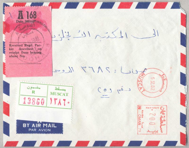 1982, registered, Air Mail cover from MUSCAT/Oman to DOHA/Quatar, meter marking in red MUSCAT 5.12.82, R Label 13860 and affixed pink label A168 Date Stamp DOHA on top left corner, reverse with oval MUSCAT 5.12.82, fresh and desirable letter, XF! Estimate 300€.