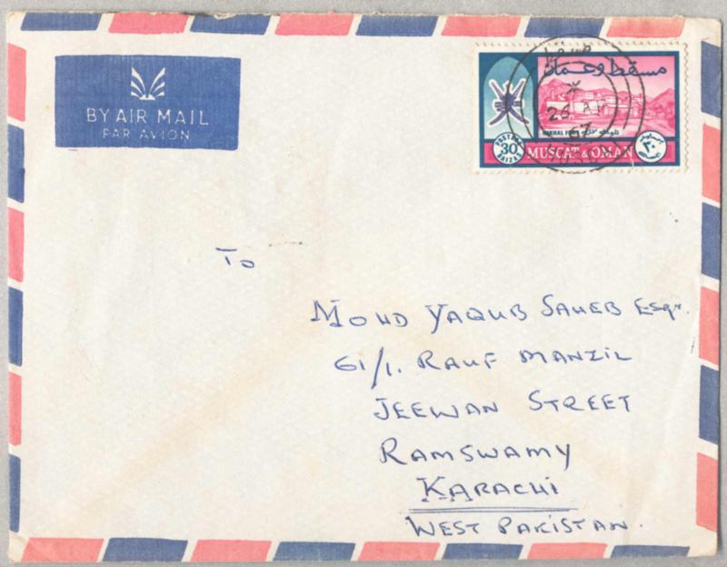 1967, 30 b., magenta and blue, on Air Mail cover from MUSCAT/Oman to KARACHI/Pakistan, tied with cds 26 AP 67 MUSCAT, reverse with arrival cancel KARACHI SADAR 1.. MAY 67, a fresh and desirable letter with a great destination, XF! Estimate 250€.