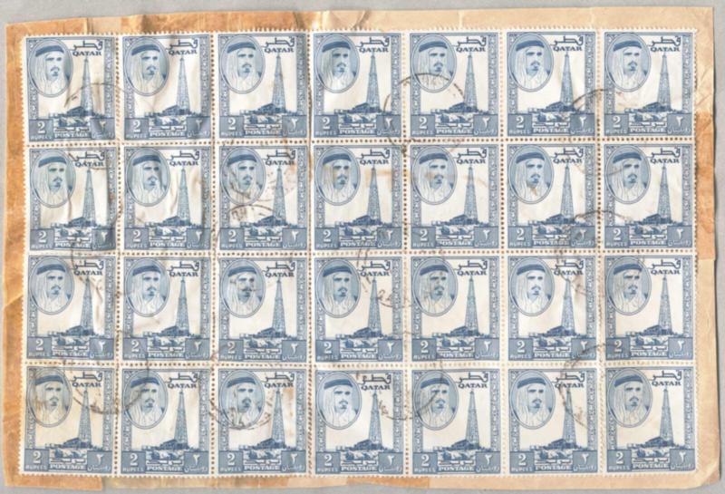 Automatisch generierte Übersetzung: 1961,2 r. Ultramarin, (Block von 28), groß Frankatur führt zu 56 r. Auf Briefstück einer Paket, entwertet mit Einheit Kreisdatumsstempel DOHA, kleinere Zähne Mängel nichtsdestoweniger eine herausragende und eindrucksvolles Stück, VF-XF! Schätzpreis 600 EUR.(Image)