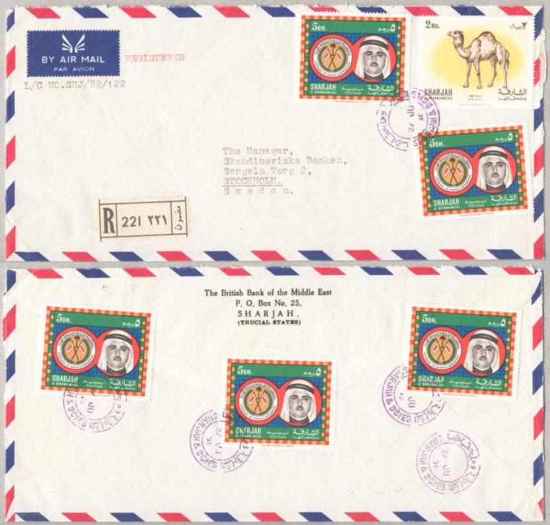 1970, 5 dh. (5) + 2 ris., on registered Air Mail letter from SHARJAH to STOCKHOLM/Sweden, tied with lilac 27 JU 70 SHARJAH & DCIES on front an reverse, R label 221 on front, a scarce stamp 2 RIs on cover - not listed in SG, fresh and desirable letter in perfect condition, XF! Estimate 300€.