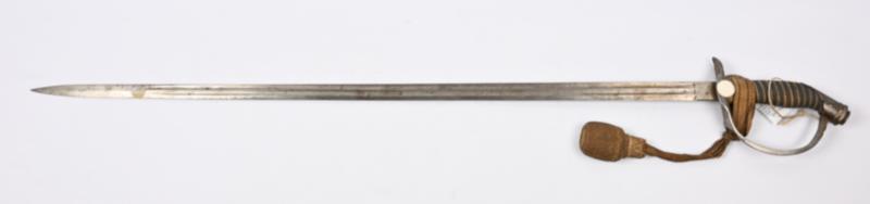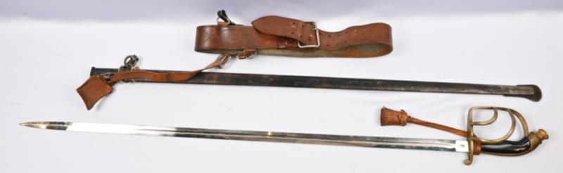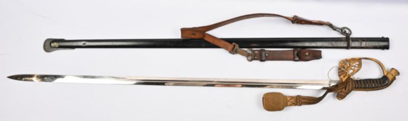 Finnish Army officer's sword m/22 with a leather m/27 hanger. The scabbard has dents and minor paint flaws. (Image)