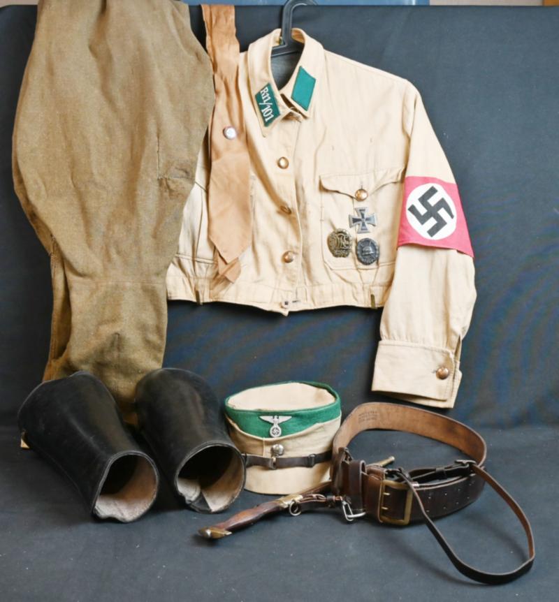 German SA (Sturmabteilung) uniform assembled from various parts. Includes a jacket (with insignias on the chest), cap, trousers, gaiters, tie (with insignia on the tie), belt, and dagger. Some items are original, while others are reproductions (Image)