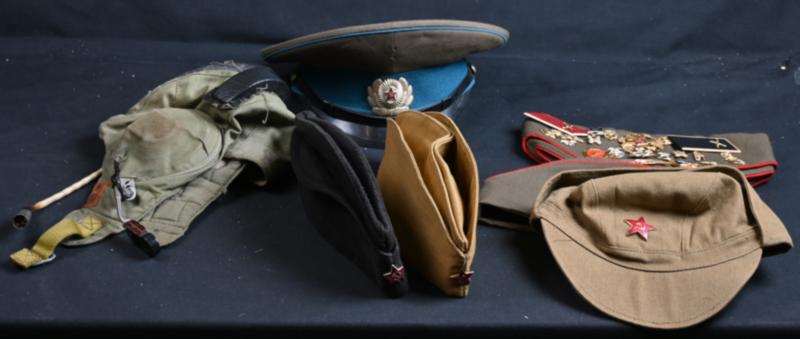 Assorted Soviet military hats, seven pieces in total, including one artilleryman's headgear. Condition varies, and one hat has several insignias attached. (Image)