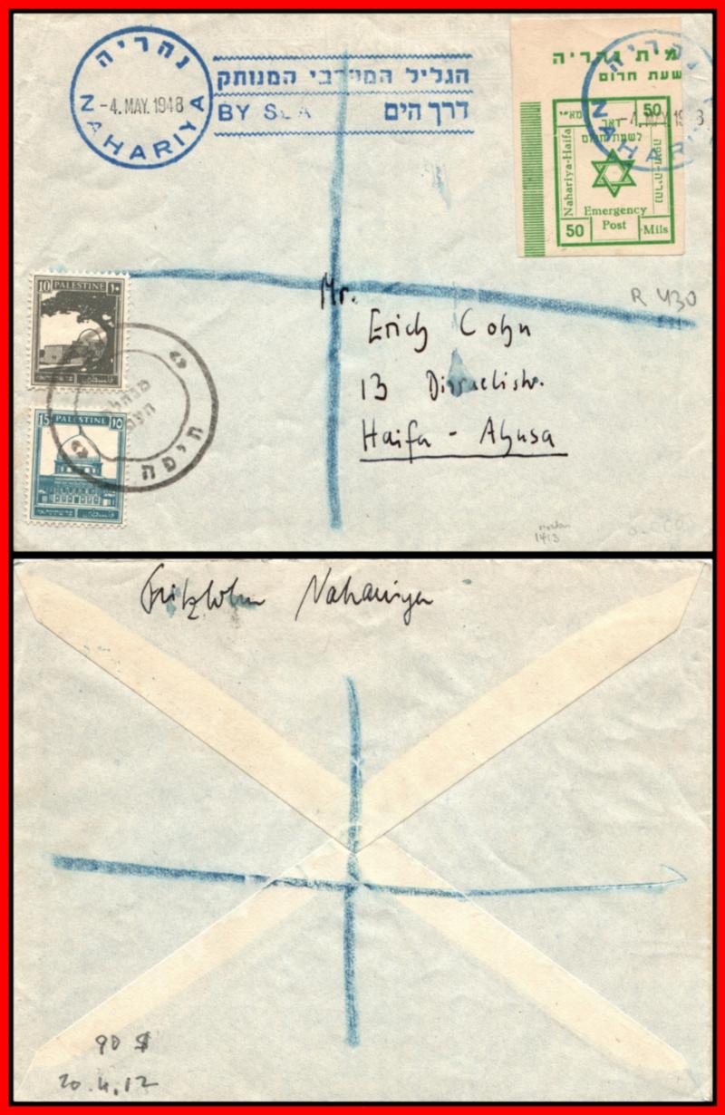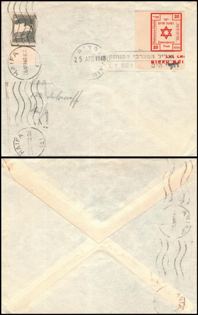 19548, Nahariya Israel Nahariya ander siege - Cover mailed to Haifa franked 20m Emergency Post imperforated stamp (taken from a sheet of 8 stamps) tied by 8th type slogan local postmark dated 25/4/1948 (Ifirst day rising fort this psmk) Naharyia “ הגליל המערבי המנותק-דרך הים”—Mils 10 Palestine Mandate stamps added in Haifa tied by Mandate machine-type postmark dated 28.4.1948. (Image)