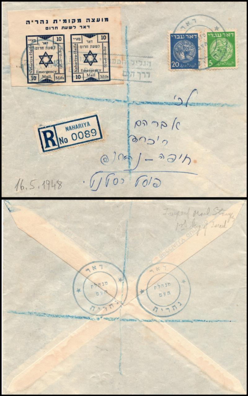 Nahariya, 16.5.1948, Interim Period Registered Cover with mixed franking, including 5m and 20m “Doar Ivri” stamps, tied with round Nahariya postmark “מנהלת העם” in blue. Also franked with two 10m Nahariya Emergency Mail imperforate stamps from an uncut double sheetlet, tied by the Nahariya special postmark “הגליל הבערבי המנותק- דרך הים” dated 16.5.48. May 16, 1948, is the day of issue for both the Nahariya Emergency Mail and the 1948 1st Coins-Doar Ivri set. Scarce. (Image)