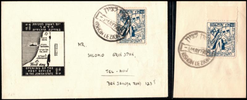 Cover addressed to Tel Aviv, postmarked 5/5/1948, with same-day arrival postmark on the back.