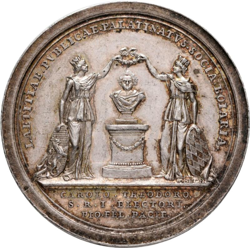 Altdeutschland und RDR bis 1800 Bayern, Karl Theodor 1777-1799: Silbermedaille 1792, von J. M. Bückle, auf die Huldigung der bayerischen Landstände auf sein 50jähriges Regierungsjubiläum als Kurfürst von der Pfalz; Forster 512, Slg. Memmesheimer 2583, Stemper 610, Wittelsbach 2308; 46,5 mm, 36,2 g, vorzüglich. (Image)