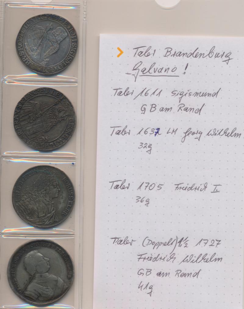 Altdeutschland und RDR bis 1800 Brandenburg-Preußen: Sammlung 4 seltene Taler als GALVANOS / Museumsanfertigungen mit Randpunze GB (Gera, Brozatus). Dabei Reichstaler 1611 vom Johann Sigismund, Reichstaler 1637 LM vom Georg Wilhelm, Reichstaler 1705 CS vom Friedrich (III.) I. sowie 1½ Taler 1727 EGN vom Friedrich Wilhelm I, dem Soldatenkönig. Alles Sammleranfertigungen / Nachprägungen, keine Originale / No genue coins. Eine tolle Gelegenheit die fehlenden Lücken durch eine Sammleranfertigung zu schließen. (Image)