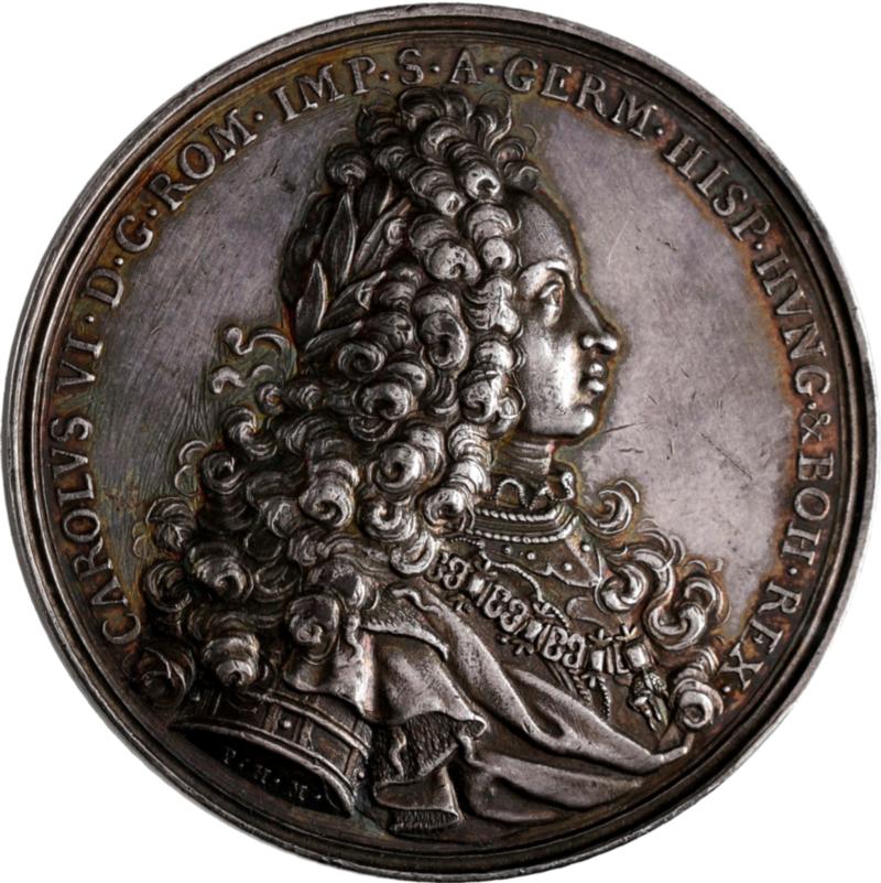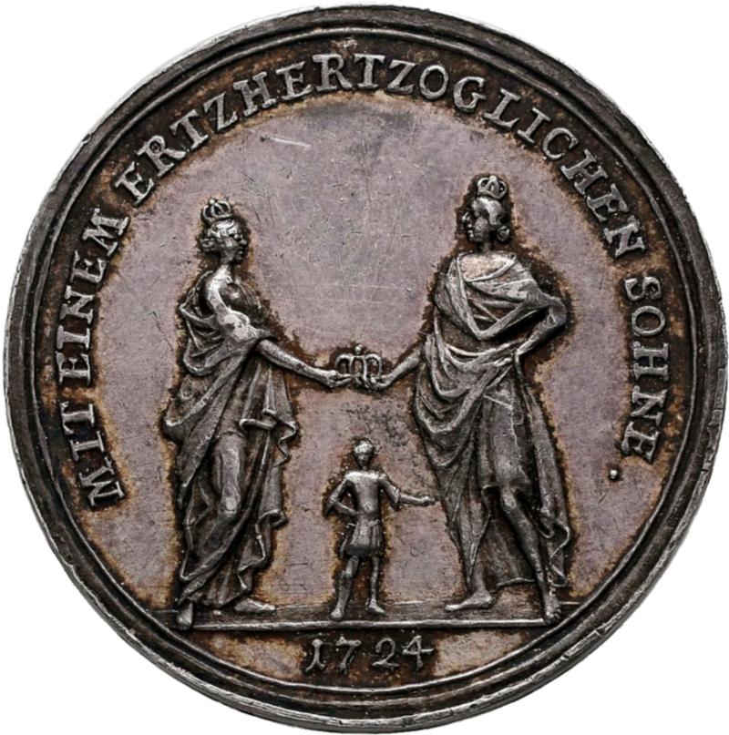 Haus Habsburg Karl VI. 1711-1740: Silbermedaille 1723/1724 auf die böhmische Krönung in Prag und die Schwangerschaft der Kaiserin. Böhmischer Löwe l., die Krone vor sich haltend. / Stehendes Kaiserpaar, die Krone Böhmen über ein Kind haltend; Slg. Montenuovo 1588, Donebauer 2689; 25,8 mm, 6,5 g, feine Tönung, feine Kratzer, vorzüglich+. (Image)