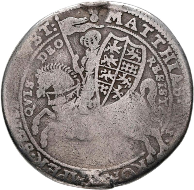 Altdeutschland und RDR bis 1800 Hohenlohe gemeinschaftlich: ½ Taler 1615, Nürnberg, mit Titel Matthias. Die Helme von Hohenlohe und Langenburg MO NO COM DE HOHENLOE ET DOM IN LANGENB// Ritter mit Fahne und Wappen auf einem aufspringenden Pferd. 12,8 g. Albrecht 72. Sehr selten, entferne Fassung, schön. Katalog-Nummer(n) : Al 72 (Image)
