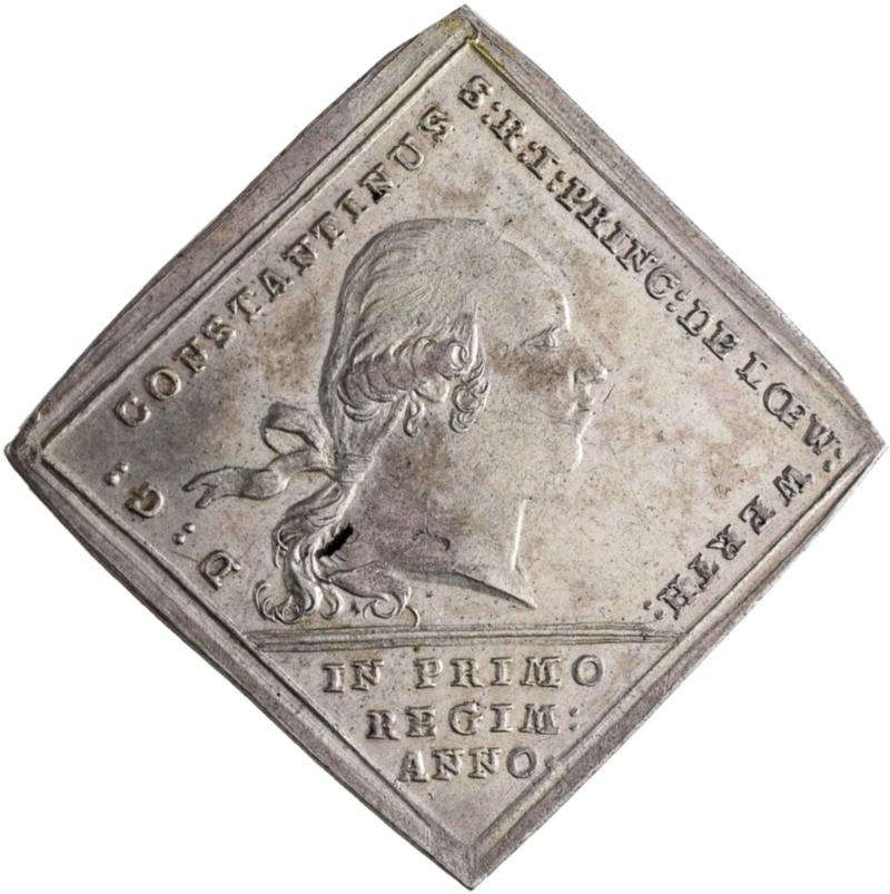 Altdeutschland und RDR bis 1800 Löwenstein-Wertheim-Rochefort, Dominik Konstantin 1789-1806: Silberklippe zu 1/3 Taler 1789, auf den Regierungsantritt. Büste nach rechts // Genius mit Füllhorn vor einem Baum mit Löwenstein-Schild.; Wibel 320, Berstett 768; 29 x 29 mm, 9,3 g, vorzüglich. (Image)