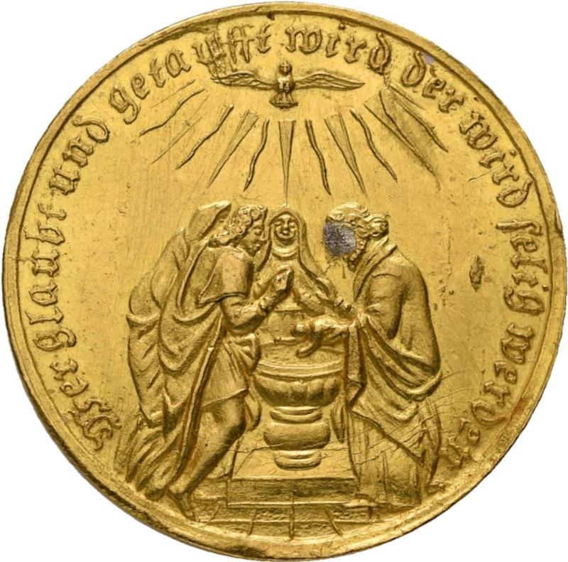 Altdeutschland und RDR bis 1800 Nürnberg: Doppeldukat / goldene Taufmedaille zu 2 Dukaten, o.J. (17 Jhd.), signiert GH (G. Hantsch). Priester tauft Kind, drei weitere Personen stehen um Taufbecken, oben Taube des heiligen Geistes und Sonnenstrahlen WER GLAUBT UND GETAUFT WIRD DER WIRD SELIG WERDEN // 6-Zeilige Schrift: MEIN PAT GEDENCT BEY DEM GESCHENCK DER CHRISTEN PFLICHT VERGIß IA NICHT WAS ICH VERSPRACH UND KOM IHM NACH. Oben und unten je ein Liebesknoten, umher Lorbeerkranz. 28,3 mm, 6,96 g. Slg. Erlanger 2446, Slg. Goppel 4383. Kleine Kratzer, Fehler im Kopf des Priesters (Lötreste?), sonst vorzüglich. Katalog-Nummer(n) : Er 2446 (Image)