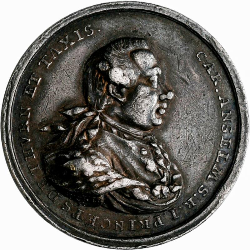 Altdeutschland und RDR bis 1800 Thurn und Taxis, Carl Anselm 1773-1805: Silbermedaille / Huldigungsmedaille 1786 von Bückle. Brustbild im Harnisch nach rechts // Fünf Zeilen Schrift mit Chronogramm über dem lorbeerbekränzten Wappen von Friedberg-Scheer. Forster 508, Slg. Wurster 1602. 35 mm, 14,69 g. Auflage nur 200 Exemplare. Feine Patina, kleine Stempelfehler und Kratzer auf dem Revers, kleine Randfehler, sehr schön - vorzüglich. Katalog-Nummer(n) : Fo 508 (Image)