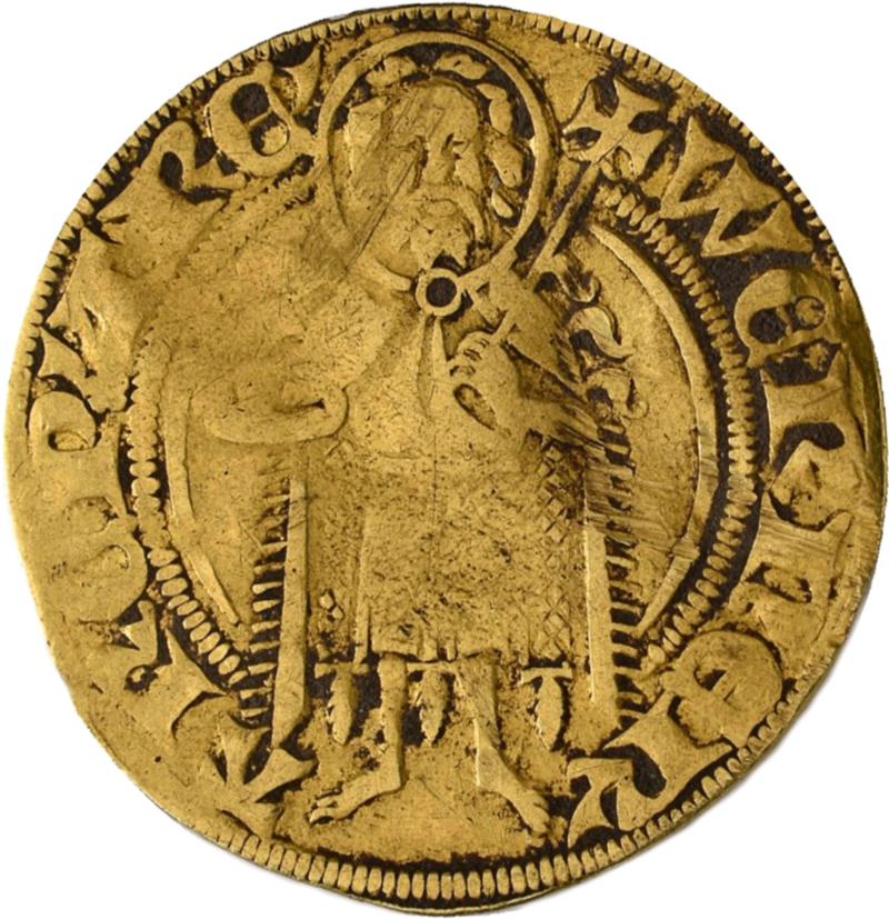 Altdeutschland und RDR bis 1800 Trier, Werner III. von Falkenstein 1388-1418: Goldgulden o.J. (1414-1417) Oberwessel. Johannes der Täufer von vorn stehend WERNER ARCP TRE // Spitzdreipass, darin gespaltener Schild Trier-Falkenstein, in den Winkeln Wappen von Falkenstein und Mainz, darunter zwei Hippokampen MONET A NOVA WESAL. 3,46 g. Friedberg 3424, Noss 358, Felke 873. Leicht Gewölbt, etwas Belag, schön - sehr schön. Katalog-Nummer(n) : Fb 3424 (Image)