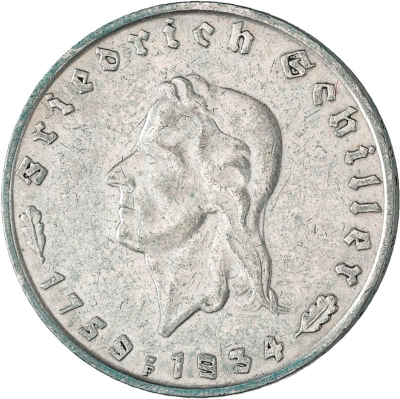 Drittes Reich 2 Reichsmark 1934 F, Schiller, Jaeger 358. Kleine Kratzer, sehr schön - vorzüglich. Katalog-Nummer(n) : J 358 (Image)