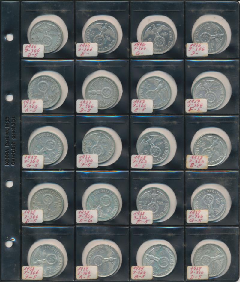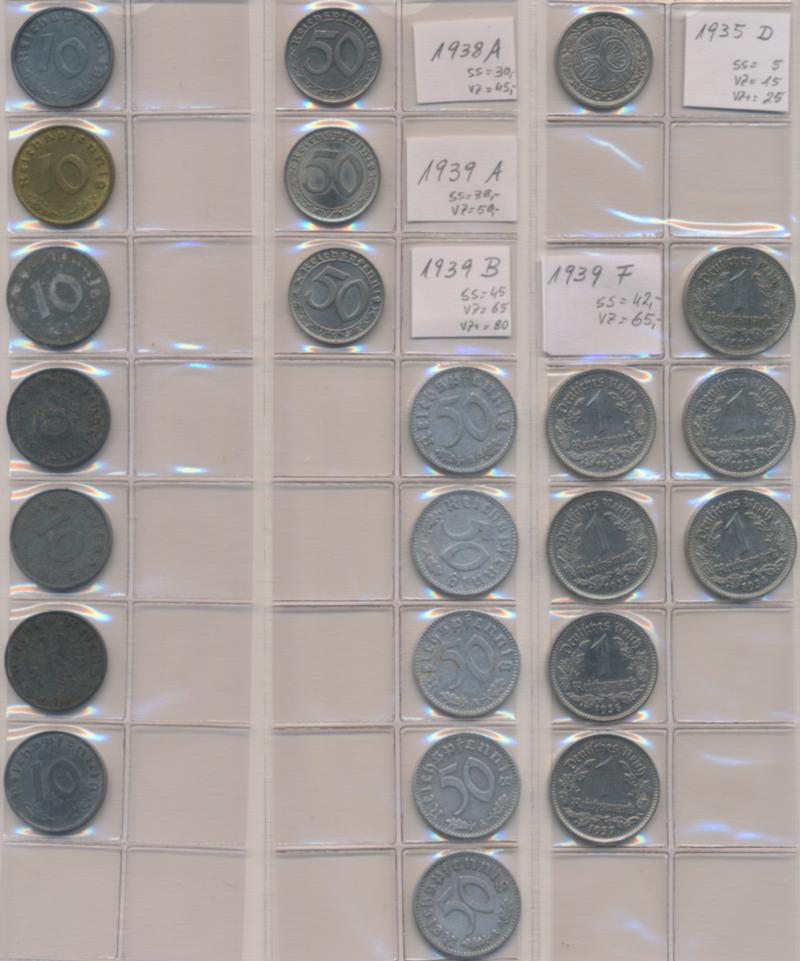 Drittes Reich 3 Münzblätter mit diversen Kleinmünzen, dabei z.B. 50 Pfennige 1938/1938 (J. 365) oder 1 RM 1933/1939 (J. 354). Beim Lot auch ein paar wenige Kleinmünzen der Weimarer Republik. (Image)
