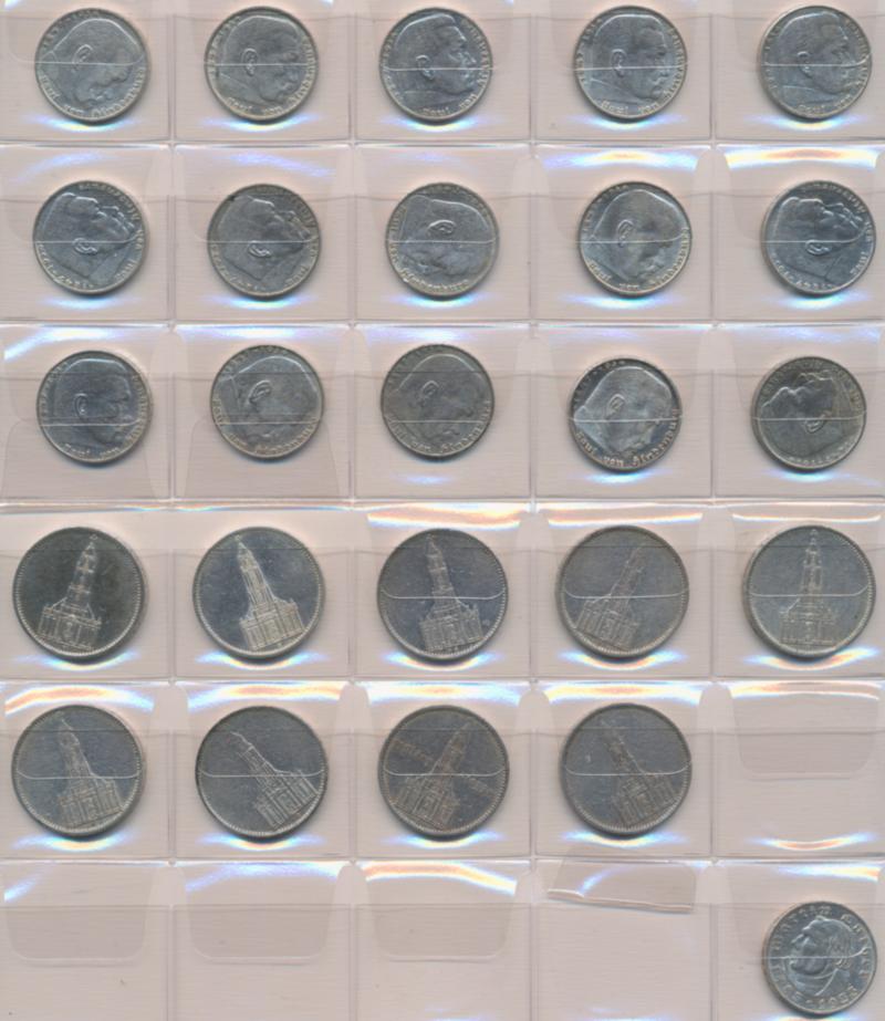 Drittes Reich Nach Jahrgang und Buchstabe gesammelte 5 und 2 Reichsmark 1933 - 1939, augenscheinlich komplett, bei Luther lediglich alle 2er dabei, Schiller je einmal 2er und 5er. Bei den 2er auch der seltene Jahrgang 1936 (J. 366) komplett, Garnisonkirche auch mit Datum. Unterschiedliche Erhaltungen, überwiegend sehr schön. Total 94 Münzen. Katalog-Nummer(n) : J (Image)