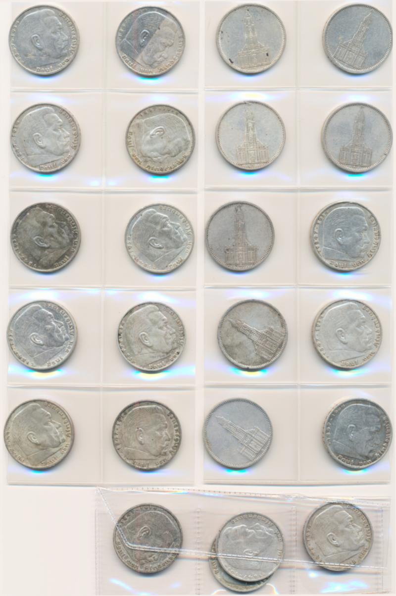 Drittes Reich Lot von 24 x 5 Reichsmark 1934 - 1939. Dabei Garnisonkirche und Hindenburg (mit und ohne HK). Unterschiedliche Erhaltungen, überwiegend sehr schön. Total 24 Münzen. Katalog-Nummer(n) : J (Image)