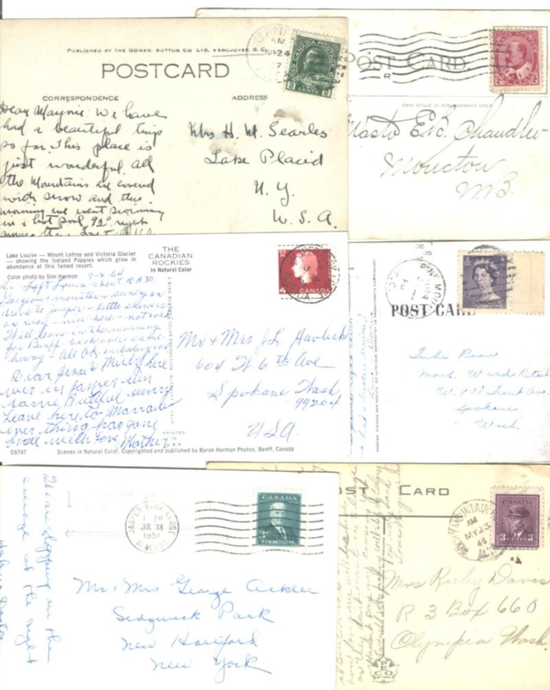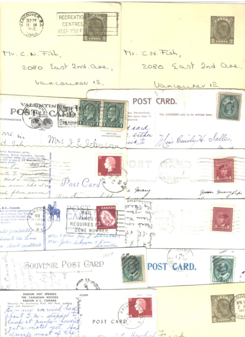 CANADA POSTCARDS Collection of postcards from New Brunswick, Manitoba and British Columbia, 12 used with stamp, 7 used no stamp and 10 unused, from the period 1909 to 1966. CV of stamps S8.40 (Image)
