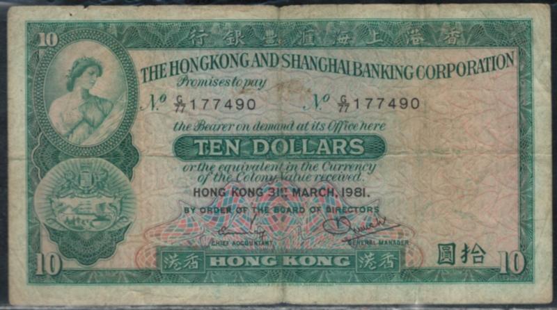 HONG KONG TEN DOLLAR BILL Nicely illustrated $10 Note issued by the Hong Kong and Shanghai Bank in 1981 (Image)