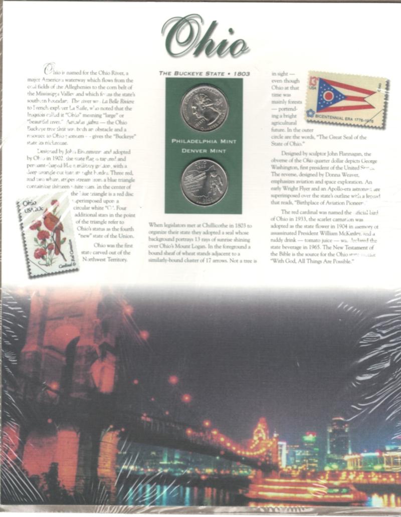 U.S.A.-MINT OHIO QUARTER SET Presentation card with the 2002 Ohio quarters from the Philadelphia and Denver Mints along with the State Flag and Bird stamps (Image)