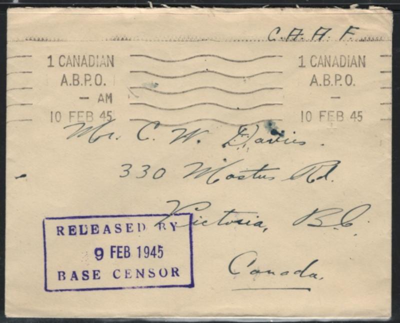 A.B.P.O. Cover from the 1 Canadian Air Borne dated Feb. 10, 1945 with a Base Censor Box stamp (Image)
