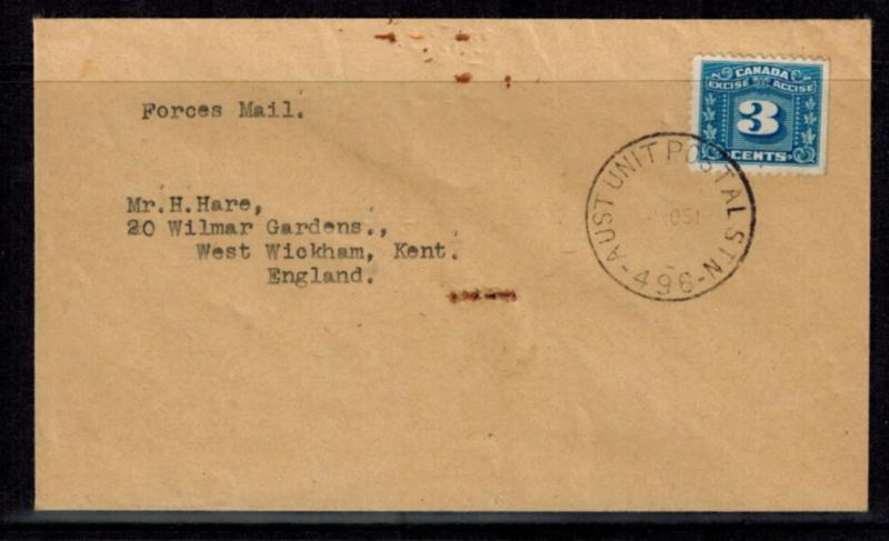 AUST UNIT POSTAL STATION / 496 Forces Mail. Perhaps mailed from the Australian Contingent during the Korean War (?). Mailed to England. Franked with 3 cent Excise stamp ( Not legal) and appears to be dated 1951. Unusual item. No marking on back of cover (Image)