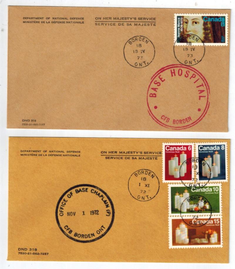 CFB BORDEN COVERS Four philatelic Camp Borden covers with Large circular cancels: "Office of Base Chaplain" (2 copies), "Base Hospital", "Base Orderly Room". All are dated 1972 (Image)