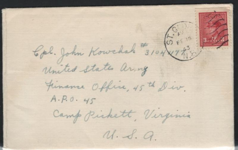 CAMP UTOPIA COVER Cover dated Feb. 19, 1943 from Camp Utopia in St. George NB to the U.S. Army Camp Pickett in Virginia. The letter is still enclosed (Image)