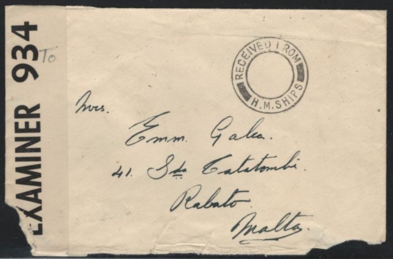 H.M. SHIPS CENSORED COVER Undated cover sent to Malta with a 2 ring "His Majesty's Ships" cancel and an Examiner 934 Censor's seal (Image)