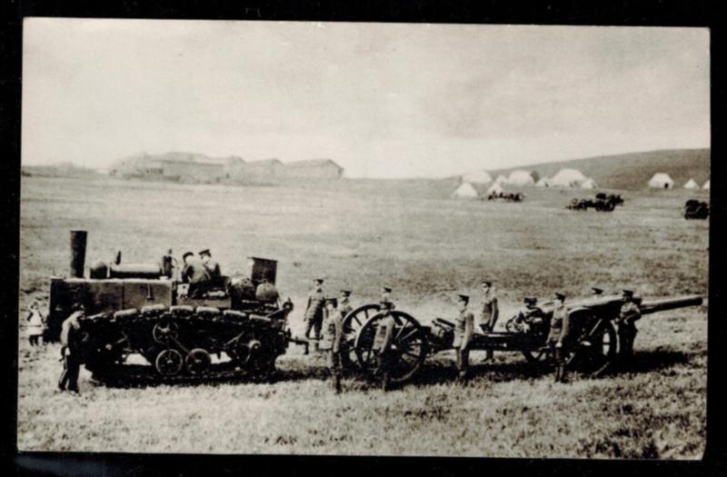 TANK AND BIG GUN ON POSTCARD Military encampment and artillery. unused postcard, circa WW1 (Image)