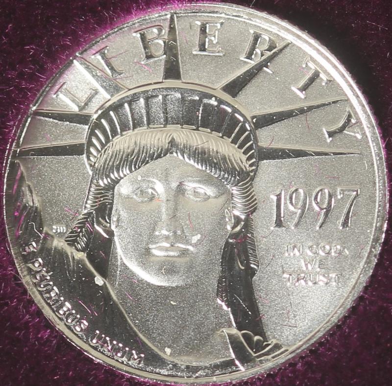 1997 One-Tenth Ounce Gem Unc in a purple fuzzy box. (Image)