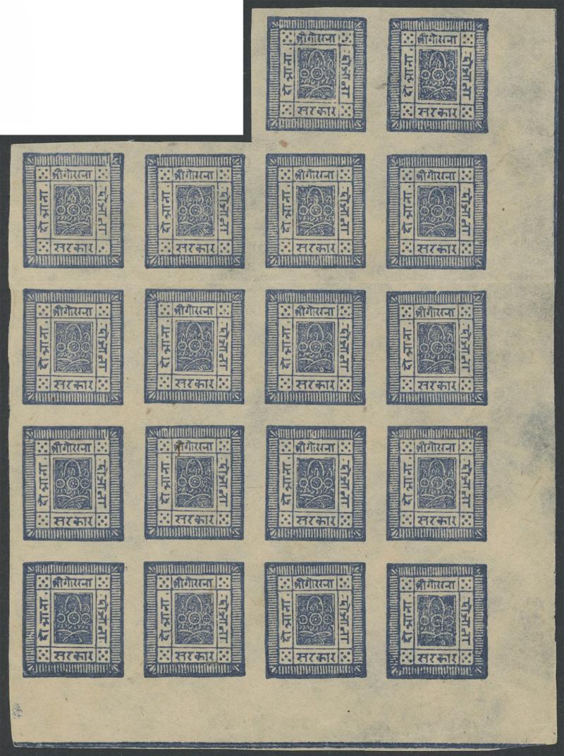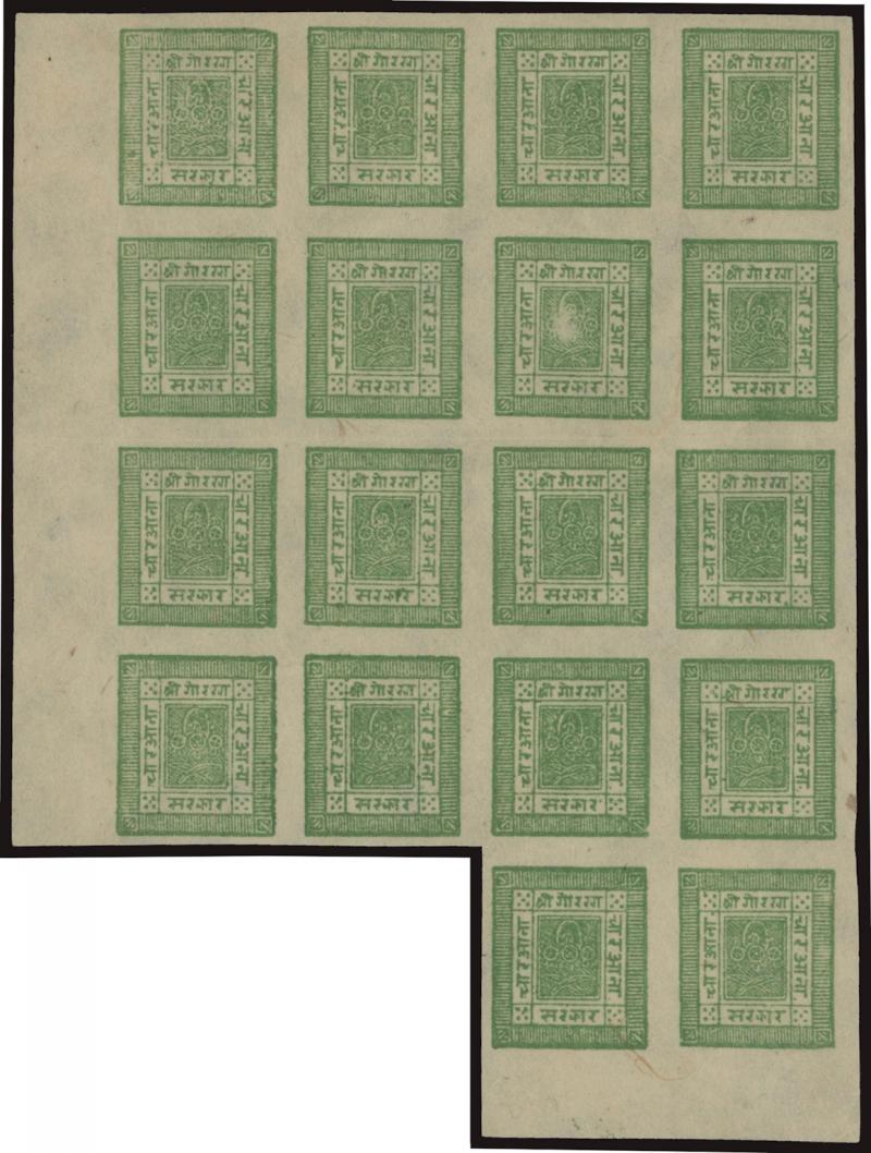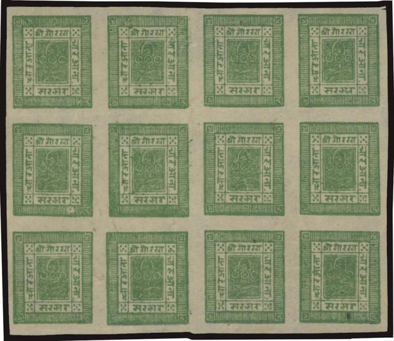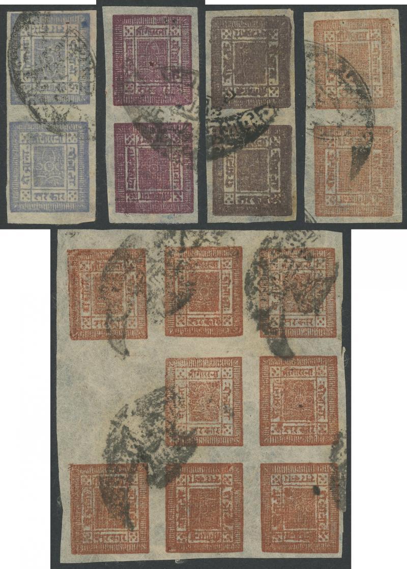 1917-30 Telegraph Period with Blurred Impressions ½a black selection comprising singles x4, Tete-Beche Pairs x2 [1-2] & [25-26], vertical strip of 4, blocks of 4 x3, block of 8, & lower half-sheet of 32 (8x4) including Tete-Beche Pair [57-58], other annotated varieties, and ½a vermilion SG 35 (F&V 16) Setting 6 singles x3 in different shades, a few faults but most are fine to very fine, various crescent-cancels including full strikes of Birganj & Kathmandu and fancy-boxed cancel of Amlekhganj, then ½a black Stg 13 complete sheet of 64 (8x8) with six horizontal or vertical Tete-Beche Pairs SG 34a, 1a dull ultramarine Stg 27 SG 27 (F&V 18) complete sheet of 64 (8x8) with nine horizontal or vertical Tete-Beche Pairs SG 27a, 1a dull blue Stg 27 SG 26 (F&V 18) Second State variant with the Clichés 'Cleaned' large-part sheet of 48 (8x6) with seven horizontal or vertical Tete-Beche Pairs SG 26a, 2a red selection with an array of shades from brown-red to maroon with Tete-Beche Pairs x17 including in blocks, 2a brown complete sheet of 56 with two blank positions & six Tete-Beche Pairs, 2a chestnut complete unused sheet of 56 with three blank positions & seven Tete-Beche Pairs, 4a green selection with a horizontal Tete-Beche Pair [53-54], blocks of 4 9 & 15, and from the Third State a block of 39 (8x4, missing the lower-right unit), and 4a bright green SG 41 Setting 12 complete unused sheet of 64 with large sheet margins, Pos [8] is the 1a Error of Colour which is also Inverted! SG 41b creating a horizontal Tete-Beche Pair, Cat £15,000+ (US$15,000+). Much on exhibit pages. A truly extraordinary study.
