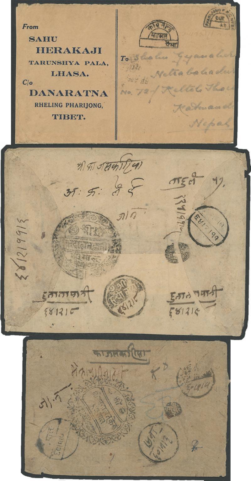 POSTAL HISTORY: 1903-39 Mail Between Nepal and Tibet comprising 1903 official from Kerong with very fine elaborate court seal, mute-circle with manuscript endorsement of "Rasuwa/16.4.1903" & intaglio cds of Trisuli; 1907 official from Kuti with very fine elaborate court seal, manuscript of Tatapani & intaglio of Chuatara (an unusually late usage of the traditional route, which was rarely used after the opening of British India border offices from 1904); 1909 jeweller's advertising envelope with ½a tied by 25½mm 'NEPAL/26AU09' cds, Indian 'BASE OFFICE/31AU09' transit & 'GYANTSE-TIBET/9SE/09/SILIGURI-BASE' arrival; 1920 from Kathmandu to "Lhassa/co Pancha Ratna/...Gyanchi Tibet" with fine 'GYANTSE/27SEP23/TIBET' arrival; 1924 with 1a tied by 31mm 'NEPAL/10JUL24' cds & superb 32mm 'GYANTSE/27JUL24/TIBET' arrival; 1936 two covers to Kathmandu with 1a3p tied to the reverse by 'GYANTSE/16APR36' cds, or with 1a only but not taxed tied by largely superb 'PHARIJONG/29AU636' cds; and 1939 to Kathmandu with Lhasa merchant's printed details & 'C/o Danaratna/Rheling Pharijong/Tibet', KGVI 1a carmine only tied by 'PHARIJONG/20DEC39' cds, largely very fine horseshoe 'PHARIJONG FPO No 81/DUE' handstamp & very fine Devanagari horseshoe 'KATHMANDU/MAHASUL' (= fee) postage due handstamp; generally fine.
