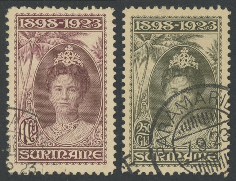 SURINAME: 1923 Silver Jubilee 2g50c (well-centred with light corner cds) & 5g (very well-centred with very fine 'PARAMARIB[O]' 1923 cds) SG 174 & 175, Cat £675. (2) (Image1)
