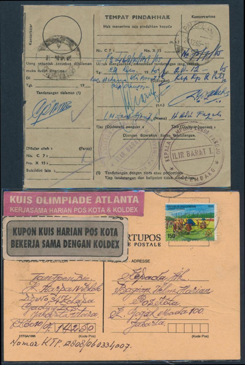 NETHERLANDS INDIES & INDONESIA: Eight cartons of sparsely-populated albums plus a group of 1960s cheques, 1960s radio licence fee stamps, hundreds of parcel cards, Netherlands Indies postmarks book & other literature. Weighs 110kg.
