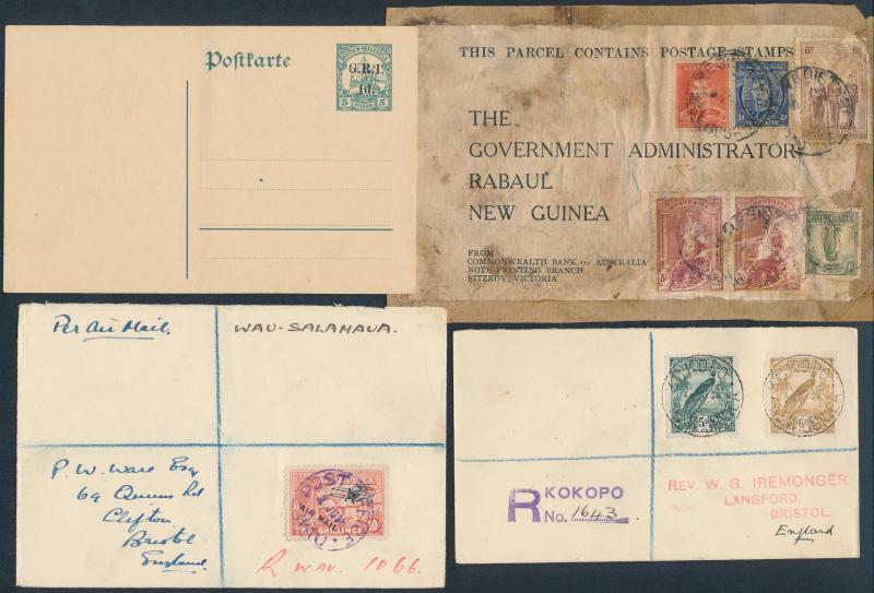 POSTAL HISTORY: Bundle with German New Guinea 10pf Postal Card with message to Hanover; 'GRI' Overprints 1d on 5pf & 2d on 10pf unused Postal Cards; Mandated Territory mostly philatelic including with rubber registration cachets of Angoram Kavieng Marienberg & Wewak and adhesives including Hut Airs 5/- & 10/-, commercial covers from Manus Wau & Kieta and another with huge 'PAQUEBOT' handstamp of Tulagi, 1937 two stampless OHMS with 'POSTAGE PAID/RABAUL' cds, generally fine to very fine, plus a rare but tragically defective circa 1940 Note Printing Branch parcel label at 11/11d rate including Robes 5/- x2.