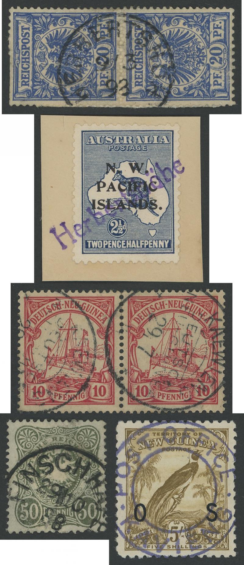 POSTMARKS: Range on Hagners including very fine 1898 'FINSCHHAFEN' on German 50pf olive, 1893 'HERBERTSHOH' on German 20pf blue pair, superb straight-line 'Herbertshohe' on NWPI 2½d on-piece, undated 'POST OFFICE/KAVIENG' in black violet (on Dated Birds 'OS' 5/-) & magenta, 'ANGORAM' in violet on Dated Birds 5/-, 'NAMATANAI' on NWPI KGV 1d 'OS', 'MARIENBERG' in violet on Huts 2/- strip of 3, 'GASMATA' in violet on Undated Birds 9d imprint pair, etc, some duplication of mostly Territory issues on-piece.