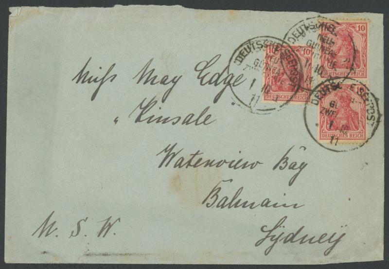 POSTAL HISTORY: 1899 PPC to Germany (code 'b'), 1911 commercial cover to Sydney (code 'a'; minor toning) & 1913 superb unused PPC (code 'b') all with 'DEUTSCHE SEEPOST/NEU-/GUINEA/ZWEIGLINIE' cds; and Marshalls 1907 commercial registered part-cover to Germany (minor stains & R label defective) & 1908 Gruss aus Jaluit PPC social usage to NSW (corner creases) both with '.../JALUIT/LINIE/ b ' cds.