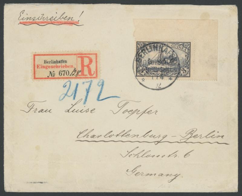 POSTAL HISTORY: 1902 (Apr 1; April Fools Day) cover to Germany with scarce albeit philatelic franking of Yachts 3mk corner example from the upper-right of the sheet tied by 'BERLINHAFEN' cds, red & black/white R label alongside, 'Bestelt/von/Charlottenburg 5/27.5.02/...' arrival backstamp, horizontal fold at the base. (Image1)