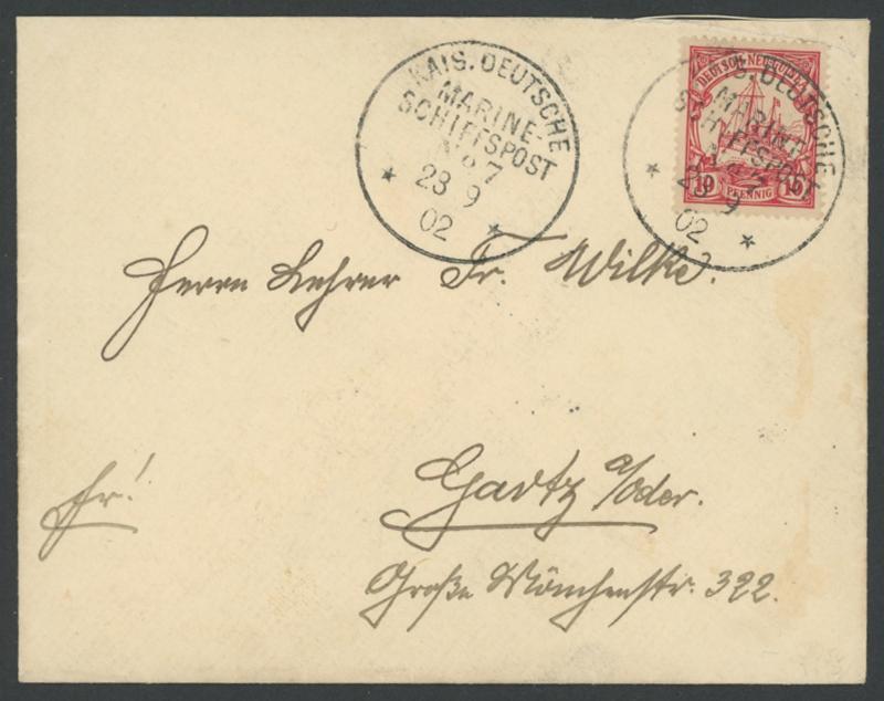POSTAL HISTORY: 1902 (Sep 28) cover to Germany with Yachts 10pf tied by one of two strikes 'KAIS DEUTSCHE/MARINE-/SCHIFFSPOST/No 7/28.9/02' cds in use aboard SMS 'Moewe', 'GARZ/10.11.02/ (ODER)' arrival backstamp. (Image1)