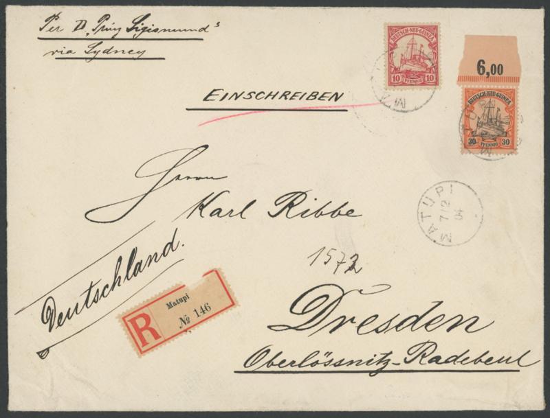POSTAL HISTORY: 1904 (Feb 2) commercial linen-lined cover (202x152mm) endorsed on the flap "Abs [absender = sender] FE Hellwig/Matupi BA [= Bismarck Archipelago]/DNG", to Saxony with Yachts 10pf & 30pf (marginal) tied by two of three strikes 'MATUPI' cds, red & black/white R label (damaged before being affixed), 'RADEBEUL/19.3.04/OBERLUSSNITZ a' arrival backstamp, minor imperfections but not folded & unusually fine for an oversize cover. (Image1)