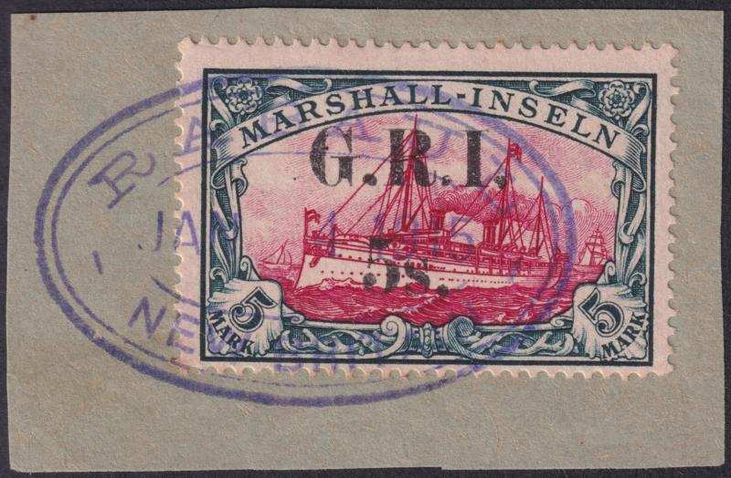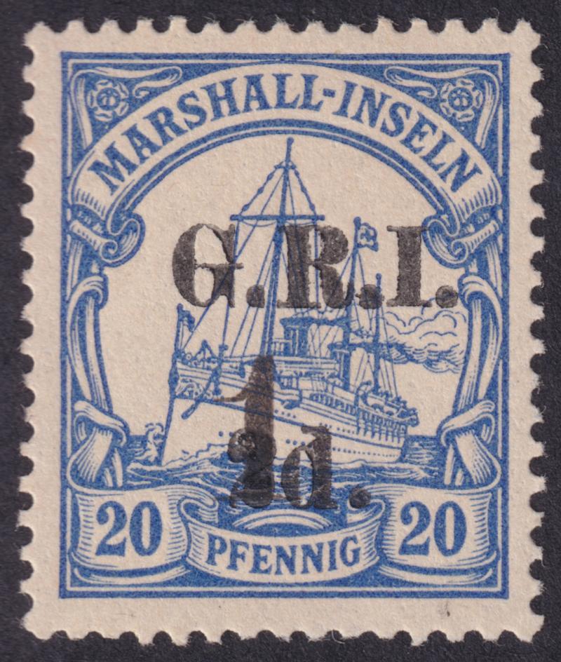 1915 Marshall Islands Additional Surcharges '1' on '2d.' on 20pf blue SG 64, unmounted, Cat £4500 for mounted. Superb. RPSL (1983) and Pascal Scheller (2018) Certificates. (Image1)
