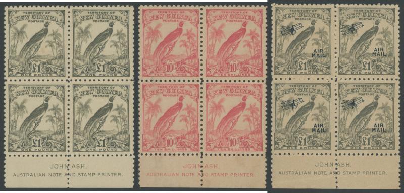 1931-34 John Ash Imprint blocks of 4 comprising Dated Birds 1d to 9d SG 150-157 plus 1932-34 Undated Birds 10/- & £1 SG 188-189 and 'AIR MAIL' Overprints 5/- & £1 SG 201 & 203 (both with even gum tropicalisation), Cat £1475+ for mounted singles.