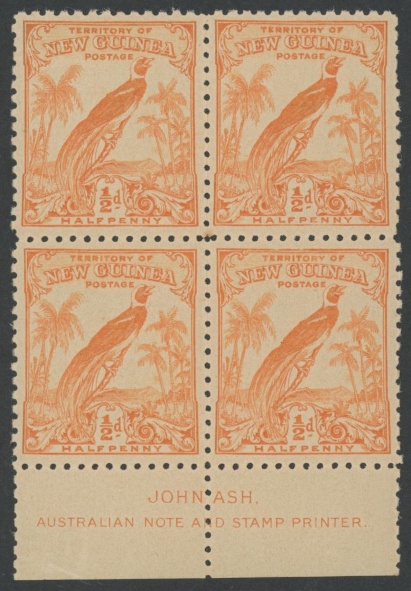 1932-34 Undated Birds ½d orange John Ash Imprint block of 4, very well-centred, a couple of nibbled perfs, characterisic light tropicalisation, unmounted, Cat £440+ for mounted singles (as it has been forever), in a footnote below SG 189. Unissued: imprint blocks are rare. (Image1)