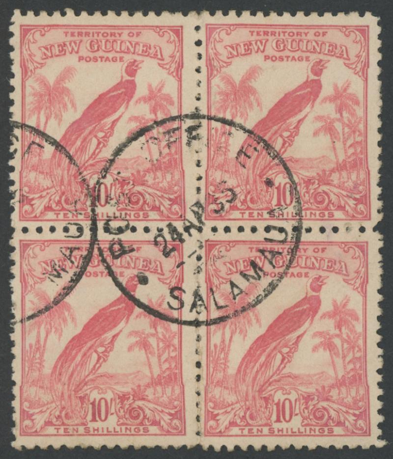1932-34 Undated Birds 10/- pink SG 188 block of 4 commercially used with central 'POST OFFICE/ 24AP33/SALAMAUA' cds, a couple of slightly uneven perfs, Cat £300+ for singles. Scarce multiple. (Image1)