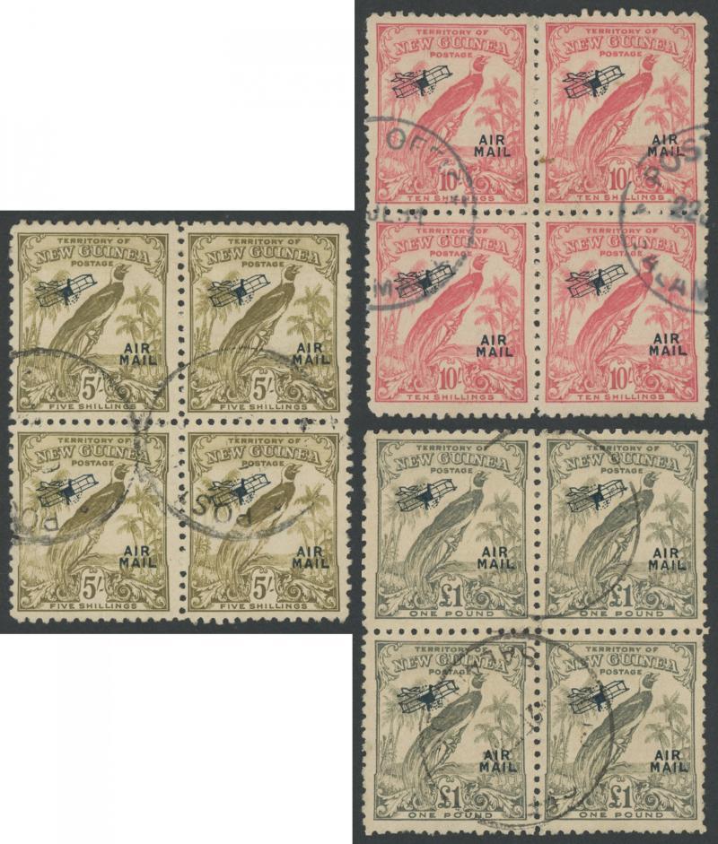 1932-34 Undated Birds 'AIR MAIL' Overprints 5/- olive-brown, 10/- pink & £1 grey SG 201-203 blocks of 4 commercially used, the 10/- especially well-centred with a small surface mark on one unit, a couple of slightly uneven perfs, Cat £940+ for singles. Scarce multiples. (3 blocks) (Image1)