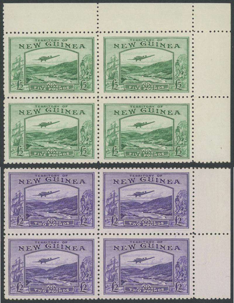 1935 Bulolo Airs £2 bright violet & £5 emerald-green SG 204 & 205 marginal blocks of 4 from the right-hand side of the sheets, the £5 being from the upper-right corner, well-centred, exceptional rich colours, full unmounted gum with characteristic light even tropicalisation, Cat £4400+ for mounted singles. Sold at our auction of 25.3.2021 for $5192 (Sale 243 Lot 1125). (2 blocks) (Image1)