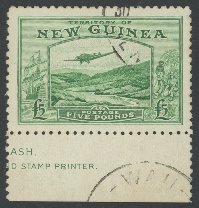 1935 Bulolo Airs £5 emerald-green SG 205 marginal single from the base of the sheet with partial John Ash Imprint, two light small-part strikes of 'WAU' cds cancel, Cat £450+. (Image1)