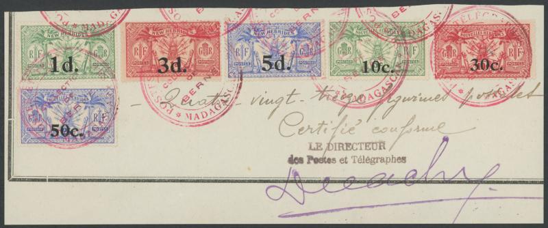 BRITISH: 1924 Surcharges on 1911 Weapons & Idols 1d on ½d to 5d on 2½d SG 40-42 plus French issue 10c on ½d to 50c on 25c SG F38-41 tied to large archival piece by multiple strikes of the large 'POSTES ET TELEGRAPHES/COLLECTION/ DE/BERNE/MADAGASCAR' cachet in rosine. (Image1)